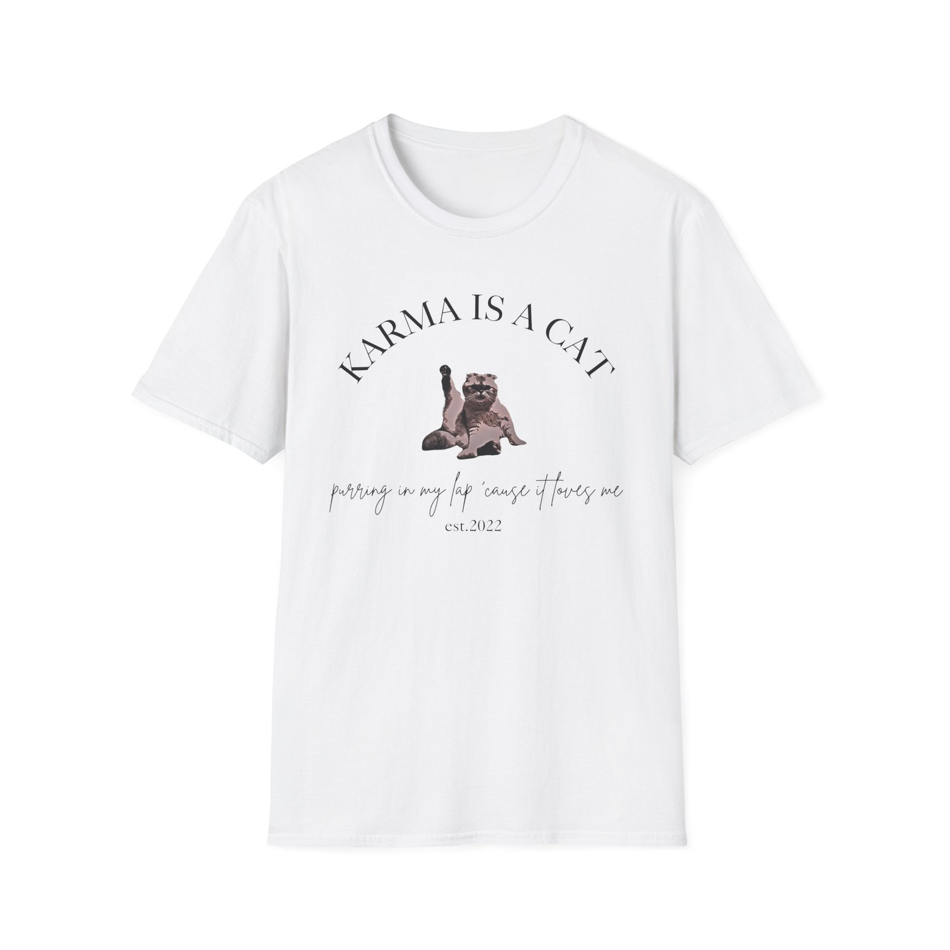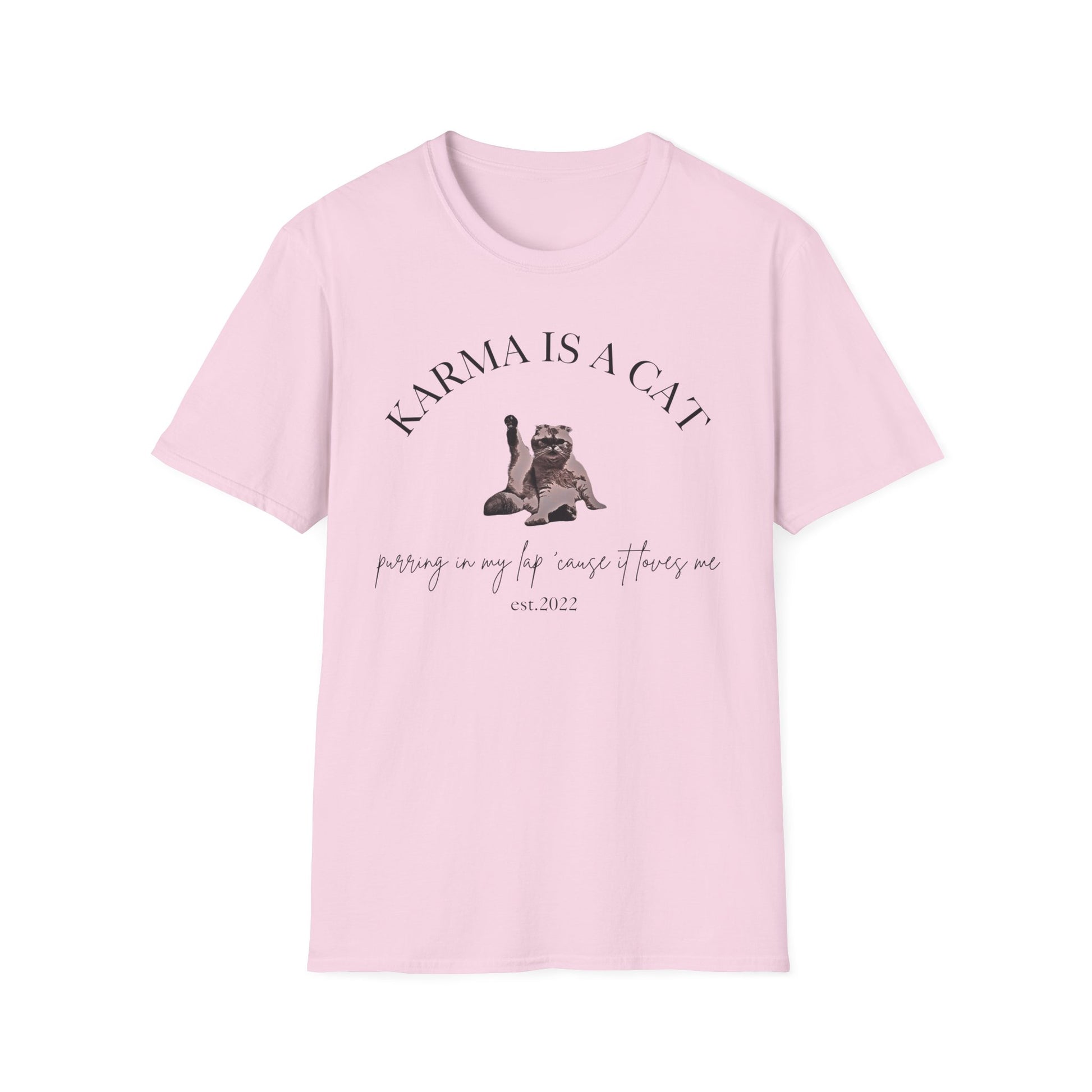 A fun Karma inspired TS tshirt pefect for TayTay fans, cat lovers, and anyone looking to add a touch of humor to their wardrobe. This t-shirt radiates a laid-back vibe that’s ideal for casual outings or cozy nights in. Picture wearing it during relaxed weekends, gatherings with friends, or lounging at home. It’s an excellent choice for those who appreciate a humorous touch and love to share their personality through clothing.